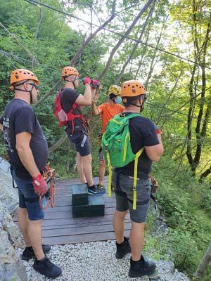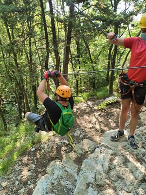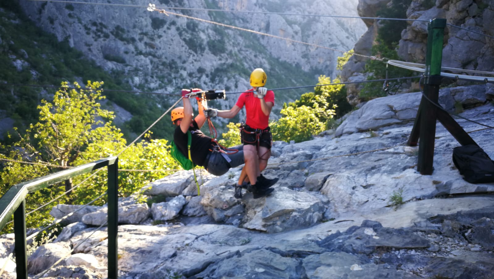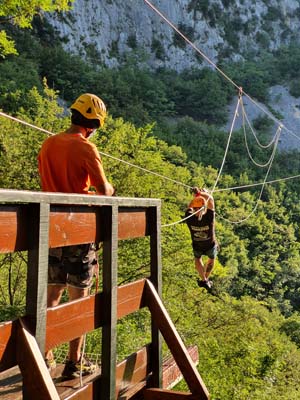U 16:45 sati dolazimo u Omiš, ulazimo u agenciju te pri potpisivanju izjave o uvjetima korištenja primijetili smo da je Igor pozelenio i ukočio se od straha. Tek tada nam je priznao za svoj strah od visine, tako da nije bilo druge nego staviti ga u čamac i pustiti da pluta Cetinom dok nas trojica sjedamo u kombi koji nas vozi do prve žice. Prije prve žice imamo kratku obuku kada svi isprobavamo na pokaznoj žici. Budući da je meni to bio prvi put, nakon kratke obuke mislio sam da je to ništa, međutim, kad smo došli na prvu žicu koja je najduža i na najvećoj visini, malo me uhvatila panika, to moram priznati. Dariju je također bilo prvi put tako da je Hrvoje otišao prvi, a mi smo nekako zažmirili i „pregrmili“ tu prvu žicu. Prva žica duga je otprilike 700 metara, a na njoj se postiže brzina do 70 km/h. Moram napomenuti da smo imali dvojicu izvrsnih instruktora te je s njima bilo puno lakše to proći. Nakon prve žice, ostalih sedam žica je „mačji kašalj.“ Nakon dva i pol sata čistog adrenalina, kombi nas vraća u centar Omiša gdje nas Igor već čeka na kavi i tako smo obilježili naš peti dan putovanja. (Zipline smo platili 400 kn po osobi, a vožnju čamcem 300 kn).
