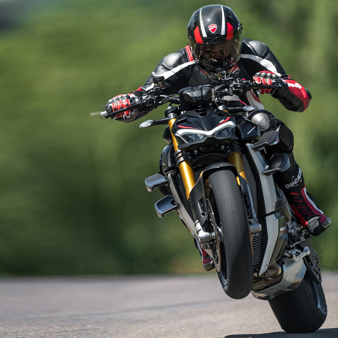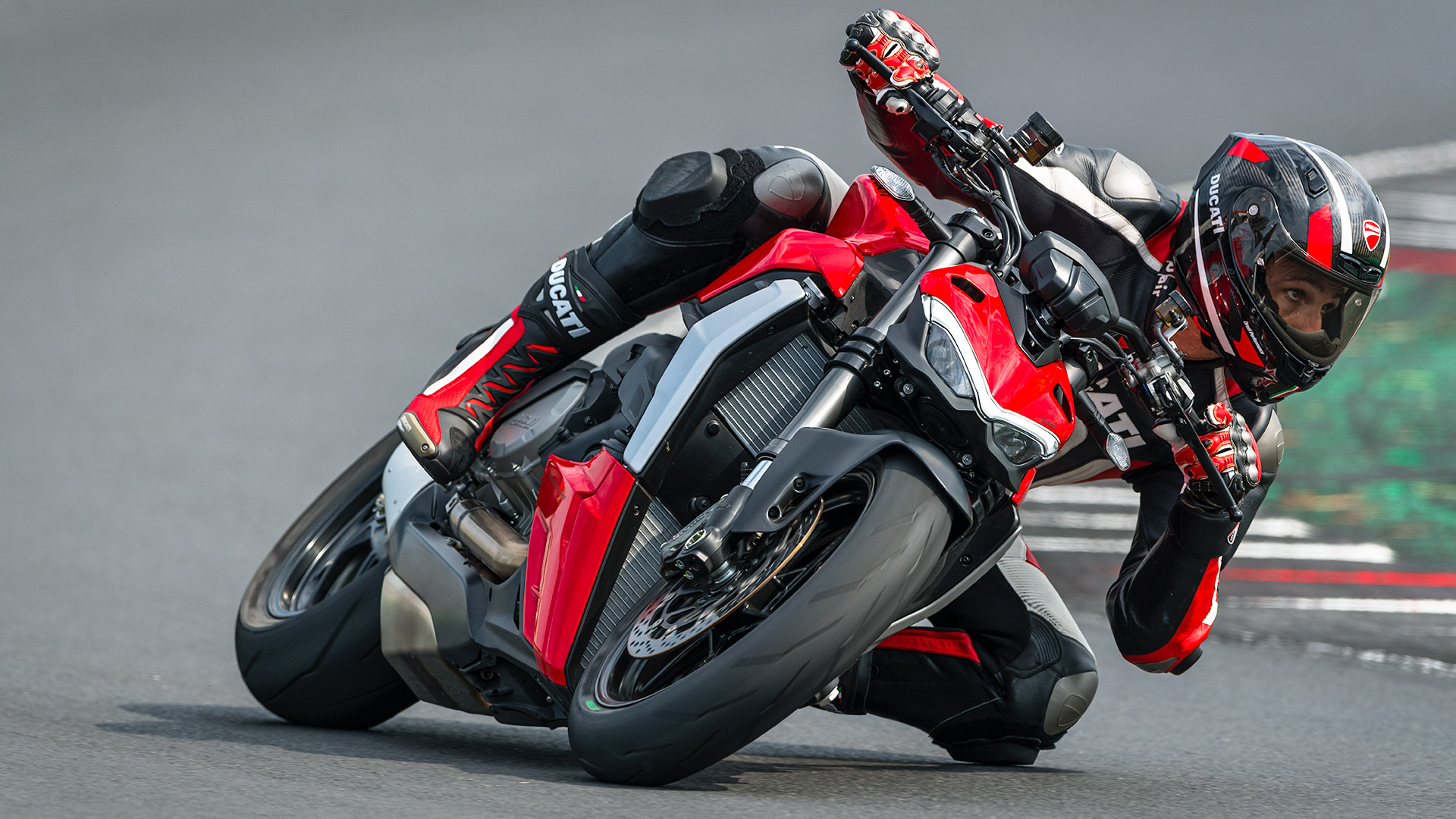 Novi karbonski naplatci, 1,4 kg lakši od onih na Streetfighteru V4 S, značajno smanjuju moment inercije i doprinose ukupnoj uštedi težine od 3 kg. Motor Desmosedici Stradale obujma 1103 ccm ima proturotirajuću radilicu, “Twin Pulse” redoslijed paljenja, 208 KS snage i 123 Nm okretnog momenta pri 9500 o/min. b osigurava učinkovitiju funkciju protiv skakanja, ali također reproducira karakterističan zvuk koji Ducatisti toliko cijene. Sveobuhvatan asortiman opreme upotpunjen je ovjesom Ohlins Smart EC 2.0 i kočionim sustavom Brembo Stylema R® s prednjim čeljustima.