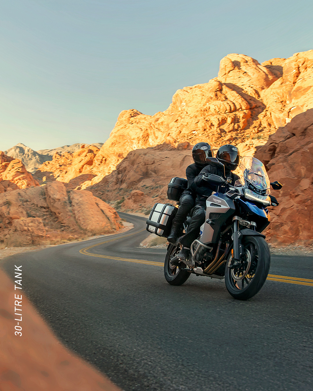 Potpuno opremljeni, s spremnikom od 30 litara i najsuvremenijom tehnologijom uključujući Triumph radarski sustav za mrtve kutove, potpuno novi modeli Tiger 1200 Explorer donosi svjetsku sposobnost i udobnost u kategoriju avanturističkih motocikala velikog kapaciteta.