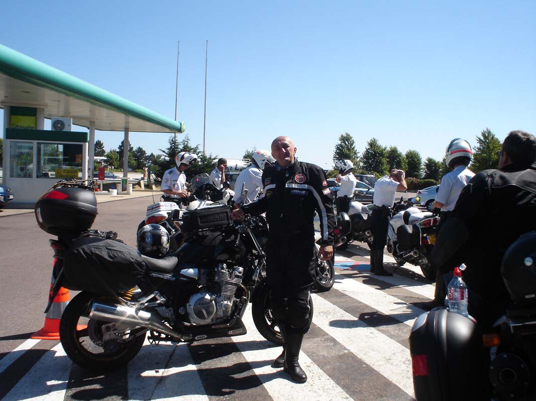 Put nas vodi ka Maconu na čijoj ćemo se periferiji odvojiti lijevo prema Genevi. Na jednoj benzinskoj pumpi susrećemo 10-tak Francuskih policajaca koji voza Yamahe FJR. One su službena vozila Francuske policije. Motocikli su potpuno novi i vjerojatno su ih vozili u neki veći grad. Pošlepali smo se iza njih jer nisu vozili ispod 180, tako smo dobar dio puta prevalili u teškom prekršaju ali pod pratnjom zakona. Može li ljepše. Kod Geneve plaćamo prvu cestarinu 27 €. Put nas dalje vodi ka Chamonixu i tunelu Mont Blanc.