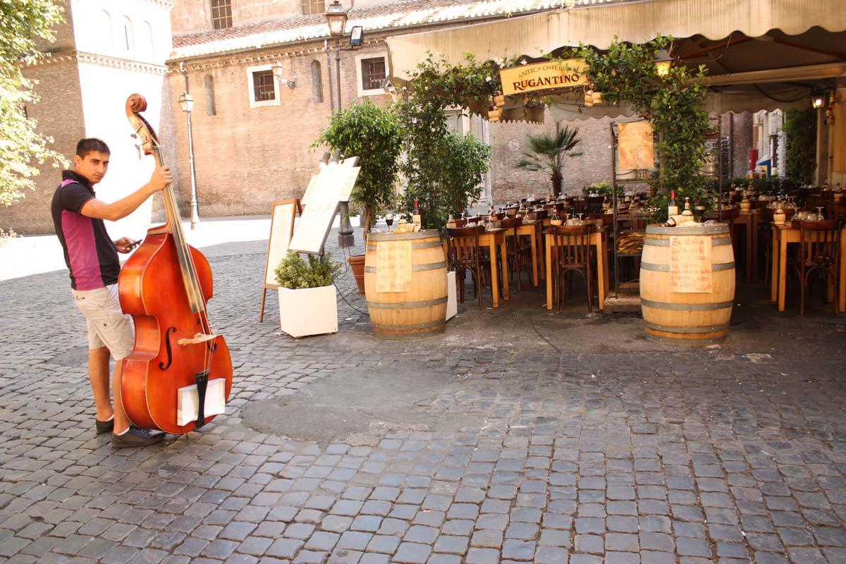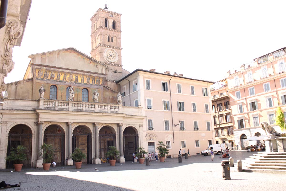Dugo uživamo na pogledu na grad, a ja se još i iživljavam na svom Canonu. Transtevere u doslovnom prijevodu znači: preko Tibera. Idemo ga onda dobro istražiti. Spuštajući se s Gianicola stižemo u sami centar Transteverea do crkve Santa Maria. Ovo je najstarija Rimska crkva sagrađena 337 godine u čast djevici Mariji. Trg i crkva vrlo su dojmljivi iako i ovdje na pločniku leže beskućnici. Desetak minuta hoda od ove crkve nalazi se još jedna važna sakralna građevina. Crkva Santa Cecilia in Transtevere. Sagrađena je iznad svetičine kuće. Cecilia je bila Rimska patricijka koja je potajno bila kršćanka. 230 godine politički protivnici držali su je tri dana zatvorenu u parnoj kupelji iz koje je ona izašla pjevajući (tako je postala zaštitnicom glazbe).
