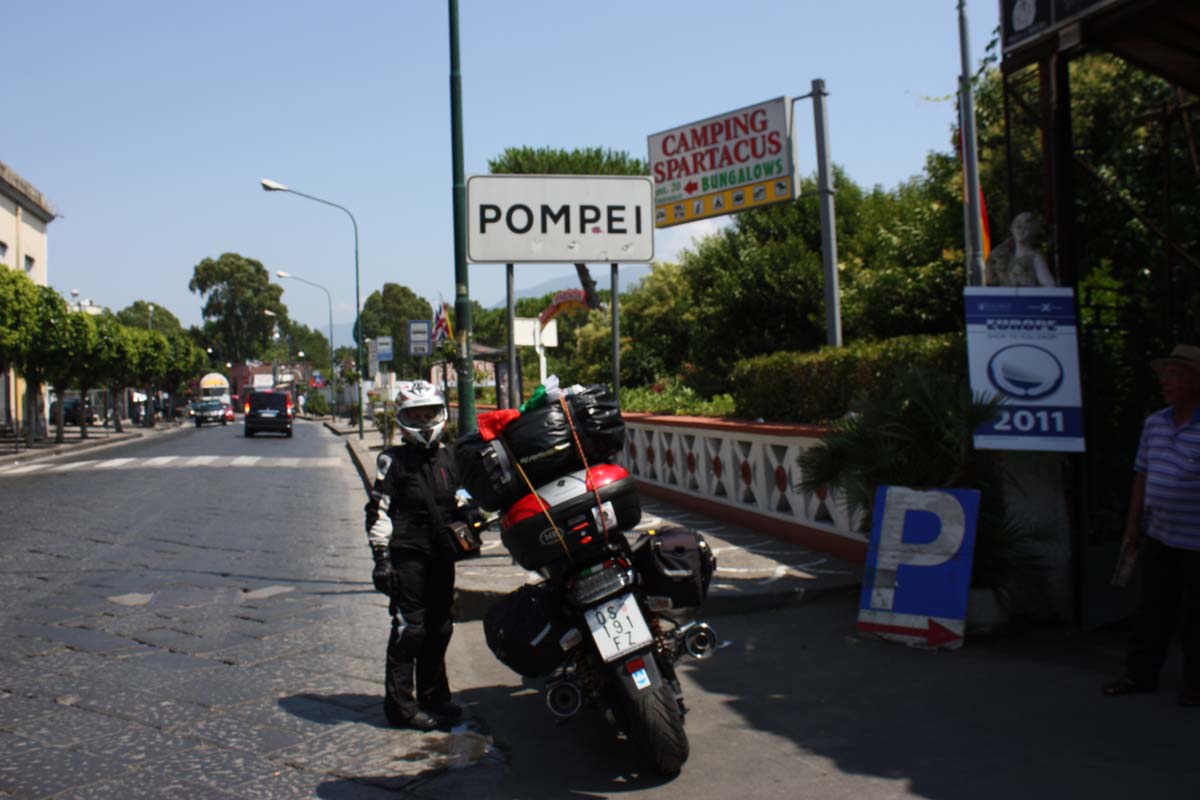 Kacige na glavi lokalno stanovništvo nema ili ih ne koristi, uključujući i policiju koja se ni ne pokušava upustiti u prometna događanja nego i oni krše zakon gdje god to mogu. Prostitutke hodaju danonoćno ulicama no na njih malo tko obraća pažnju. Nakon kraćeg obilaska grada ulazimo u povijesnu jezgru starih i uništenih Pompeja. Ulaznica je 11 eu po osobi. Već na samom ulazu zaključili smo da se radi o nekoć velikom gradu koji je Vezuv nesebično počastio gomilom lave i pepela ne ostavivši mu ni najmanju šansu za preživljavanje. Grad je građen po principu šahovske ploče i sve su ulice gotovo identične.