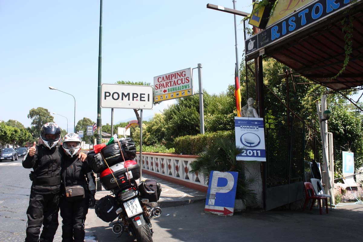 Danas ćemo pokušati doći do Pompea, a to znači da nas čeka 800 km puta. Po cesti na kojoj su večim djelom radovi i prilična vrućina stigli smo do campa Spartacus . Čim smo se raspremili otrčali smo u bazen. Motor smo ostavili natovaren jer ujutro idemo dalje. Ranije smo otišli na spavanje jer nas čeka još oko 1100 km do Hrvatske.Nakon jutarnje kave držimo se route koju nam je ponudio naš Garmin. Kod Rima se odvajamo na auto stradu koja izlazi na Jadransku obalu u visini Gullianove.