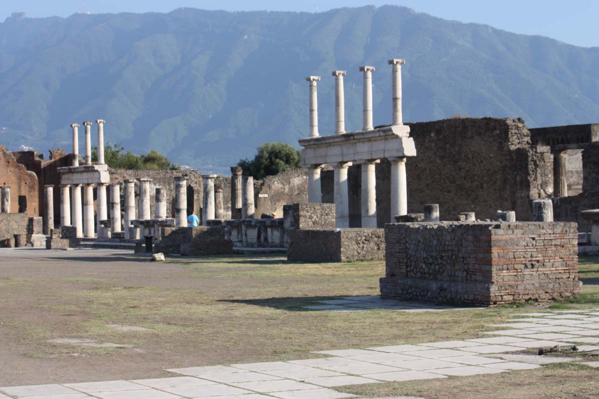 Nakon dugog hodanja po ruševinama stigli smo do glavnog trga. Očekivali smo da ćemo uz put vidjeti okamenjene ljude i životinje u trenu kada ih je zatekla nesreća erupcije vulkana. Svi oni su međutim premješteni u nekakvo improvizirano skladište i poslagani na police kao figure zajedno sa iskopanim predmetima iz svakodnevnog života onog doba. Povremeno bacim pogled na 20-tak km udaljeni Vezuv i izgleda mi nemoguće da je uspio takom brzinom i tako daleko dobaciti sadržaj svoje utrobe do ovih nesretnika.