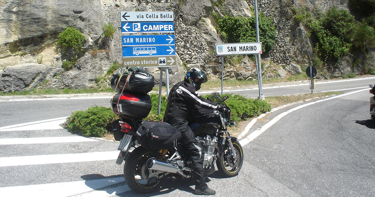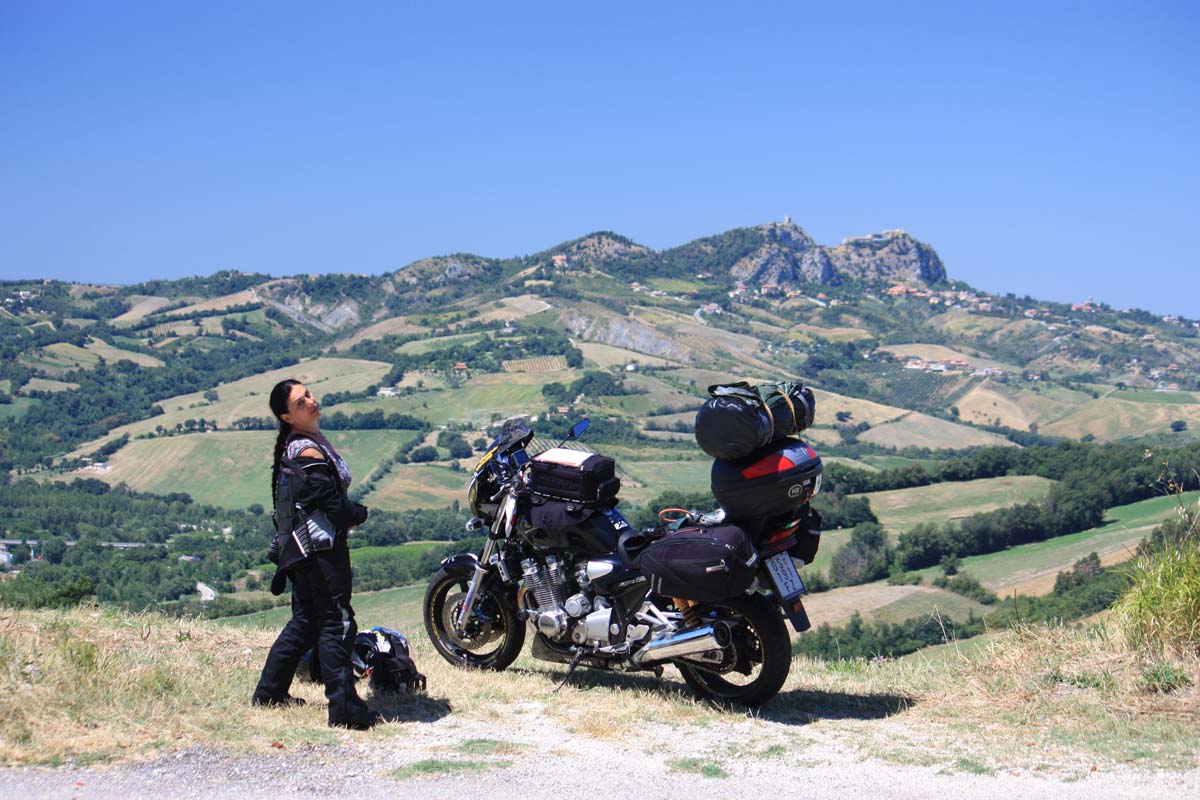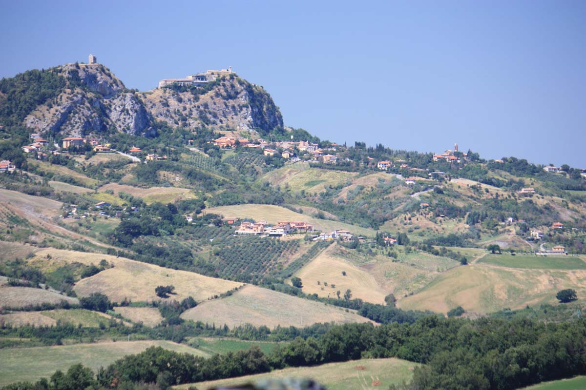 Kod Arezza se odvajamo prema San Marinu. Ovdje počinje prava golgota zbog ceste koja je toliko loša i uska da bi i momci sa enduro motorima imali dosta muke. Priroda je predivna, ali kao da nije dala mogućnosti da se njome prođe bez puno truda. Kako je jedan frend davno rekao „sve sama jama budi bog s nama“. Zaključujem da smo brže napredovali 1943. prema Staljingradu. Na nekakvim kolcima pribijenim uz put stoji natpis Rimini. Držimo se putokaza kao pijan plota i nakon 50-tak km kroz ovo bespuće izbijamo na odličnu cestu ispred San Marina. Dok se uspinjemo cestom u grad pred nama se otvara panorama kakva se rijetko viđa. Osjećaj je kao da nismo na zemlji nego na nekoj drugoj planeti. Riječ nepregledno ovdje gubi svaki smisao. Pogled seže preko brda i brda i opet brda i dolina i udolina i opet i tako bez kraja. Savršeno. U San Marinu radimo pauzu od sat – dva, taman dovoljno za ručak, kratak obilazak, i naravno kupovinu parfema, jer ovdje je bescarinska zona i cijene pojedinih artikala su i do pet puta niže nego drugdje.