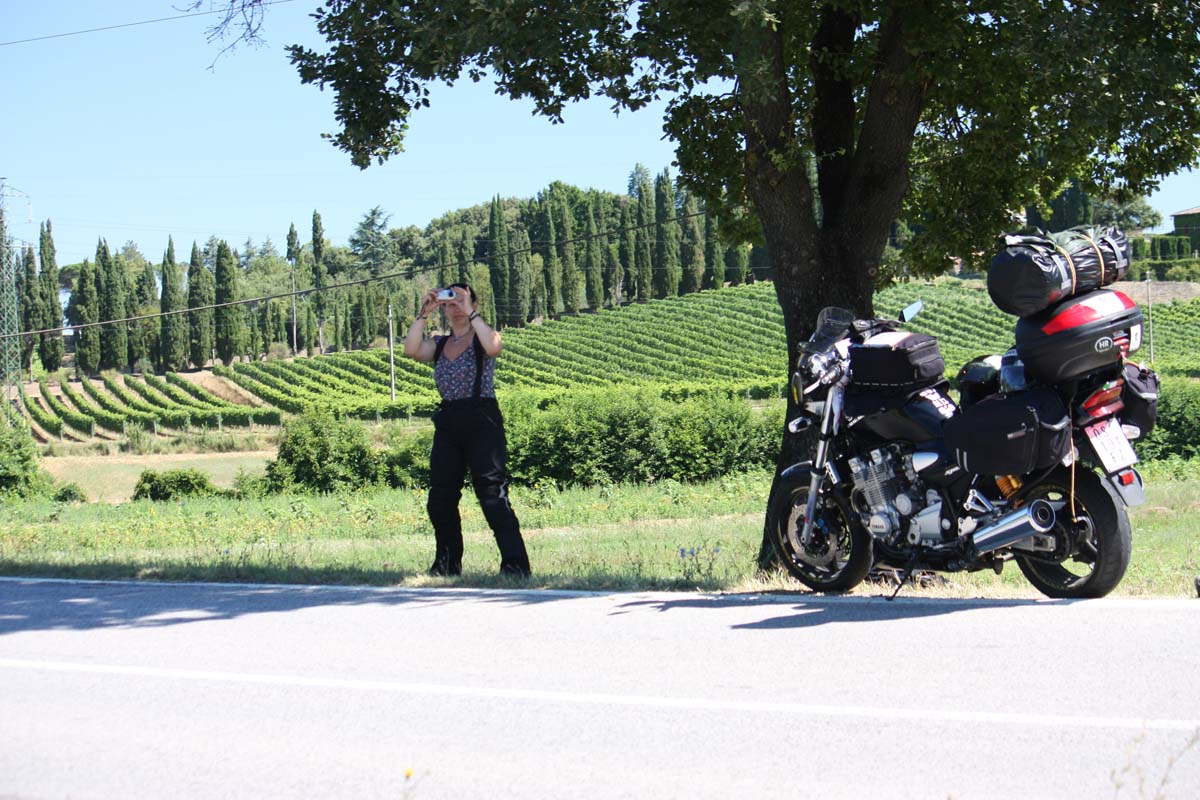 Nakon odmora brzom cestom prilično brzo vozimo put HR. Rimini, Ravenna, Chioggia, Padova, nižu se gradovi jedan za drugim. Gužve su velike i tu do izražaja dolazi prednost našeg prometala. Probijamo se naprijed kroz gužvu. Kod Venezie se uključujemo na auto stradu Dell Sole pa pravac Trieste. GO!!!!!!!!! GO!!!!!!!!! Veče se polako spušta dok ulazimo u Deželu. Ovdje podižemo vizire otpuštamo gas do minimuma i lagano vozimo prema domovini. Poviše Rijeke, na Vratima Jadrana stajemo na kavu i uživamo u pogledu što seže preko Opatije, Lovrana, Ike i Ićića koji sijaju u vedroj noći kao ogledalo zvjezdanom nebu. Miris najljepšeg mora na svijetu uvlači se u svaku poru našeg bića i podsjeća nas da ljepšega nigdje nije. TOSCANA! Tisućama stihova opjevana, na stotinama slika naslikana, majka Europske kulture, renesanse, relikvija i čuda, nikada do kraja istražena, kroz vječnost će pričati svoju priču isprepletenu savršenom ljepotom, vinovom lozom, čempresima, mirisima pokošenog sijena i suncem obasjana.