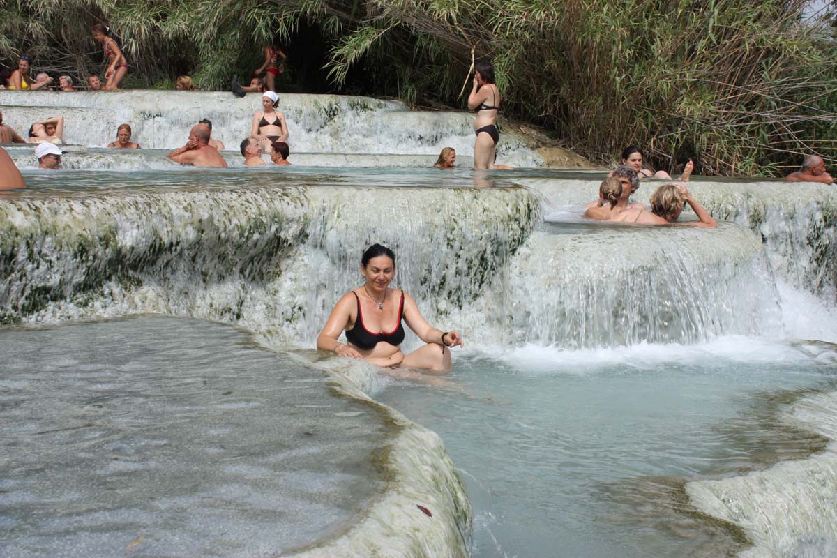 Nakon sat i pol stižemo pred Pitigliano. Vidikovac na rubu ponora nasuprot gradu obavezna je stajanka za sve koji odavde prolaze. Ovaj pogled se nemože opisati riječima. Grad se uzdiže doslovce iz stijena i doima se gotovo nestvarno. Kraj jedne fontane se rashlađujemo, a potom uskom brdskom cestom odlazimo do Sorana. Gotovo je identičan Pitiglianu i doslovno se skliže sa svoje stjenovite hridi. Slijedeće mjesto na našem putu je Sovana. Ovaj skromni zaselak je rodno mjesto Pape Grgura VII iz 11. stoljeća. Na glavnom trgu nalaze se srednjevjekovni Palazzo Pretorio i crkva Santa Maria sa freskama iz 15 st. Po okolnim brdima i dolinama nalaze se mnoge etruščanske grobnice. Kruna našeg izleta ovoga dana svakako je Saturnia. To je mjesto sumpornih izvora čija topla voda i blato bogato mineralima od antičkih vremena pomažu koži i dišnom sustavu. Tu su i istoimene toplice pored kojih prolazimo i zavojitom se cestom spuštamo do Cascata del Gorello nekih dva kilometra južnije. Ovo je zaista fantastično. Iz velike stijene šikljaju dva golema izvora tople vode. Stepenasto se preljevaju preko mnoštva cascada praveći male bazenčiće u kamenu te se slijevaju niz dolinu u toplu riječicu. Ovdje se banjamo sa mnoštvom turista do kasno popodne. Čak nam se pred kraj dana ovdje ukazao nekakav Isus. Sav istetoviran i u nekim krpama s prekriženim rukama izašao je iz Peace Brother kombija sa svojim društvom nalik na apostole i sa dvije peace sestrice. Taj vrlo loš replikant izgledao je kao da će u najmanju ruku održati Govor na Gori. Umjesto toga zapalio je joint i kada je povukao par dimova otišao je kako je i došao.“ Apostoli“ i dvije sestre odoše za njim. U drvenjari pored ovog raja pijemo Italiano esspreso i Coca-colu.