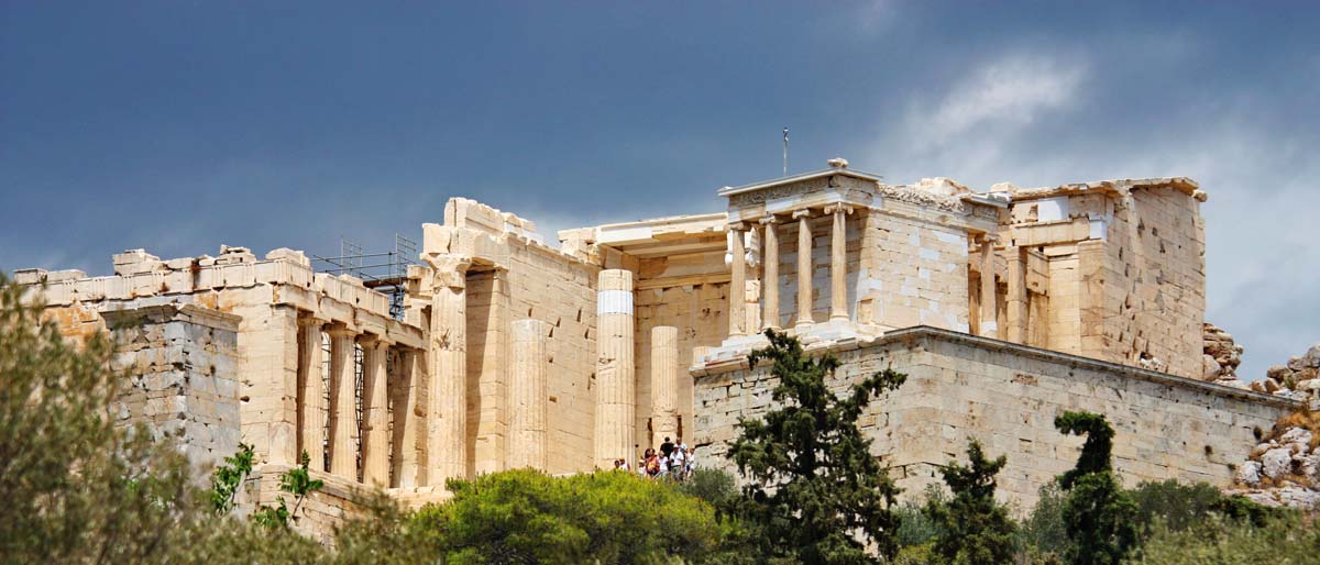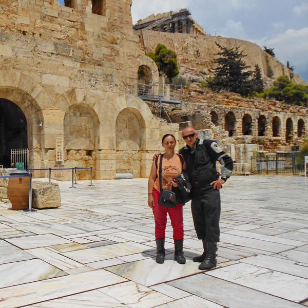 Zaustavljamo se ispod „Svete Stijene“ i hramova koji se smatraju najvažnijim spomenicima zapadnog svijeta, zbog toga što su oni imali najveći utjecaj na zapadnjačku arhitekturu. Većina ovih mramornih remek djela podignuta su tijekom Periklove vladavine u drugoj polovini 5 st. pr. Kr. u tkzv. zlatnom dobu Atene. Većina ih je posvećena Božici i zaštitnici grada Ateni. Tek što smo sišli s motora,uzeli foto opremu u ruke i pogledali štetu na bočnom koferu crni oblaci su se nadvili sa svih strana. Nije trebalo dugo čekati da se iz njih izlije tolika količina vode kakva se rijetko može vidjeti. Kao prekaljenom uživaocu kiše na motoru prvo što mi je palo na pamet bila je misao :“pa ti gdje god da odeš sobom nosiš kišu pa eto i u uvijek sunčanu Grčku“. Diosta nevjerovatno. Lije kao iz kabla. U jurišu pokušavamo spasiti što se spasiti može no već je prekasno jer kiša nas je doslovno potopila. Jedino fotiće i objektive uspjevamo zaštititi a tank torba,jakne i ostala oprema izgledaju kao da su izašli iz perilice rublja bez centrifuge. S ostalim turistima ispod neke strehe čekamo oko sat vremena da se situacija malo smiri.