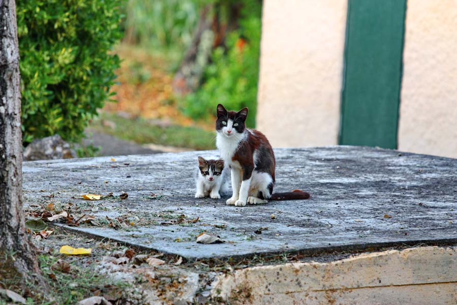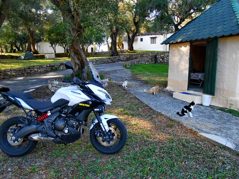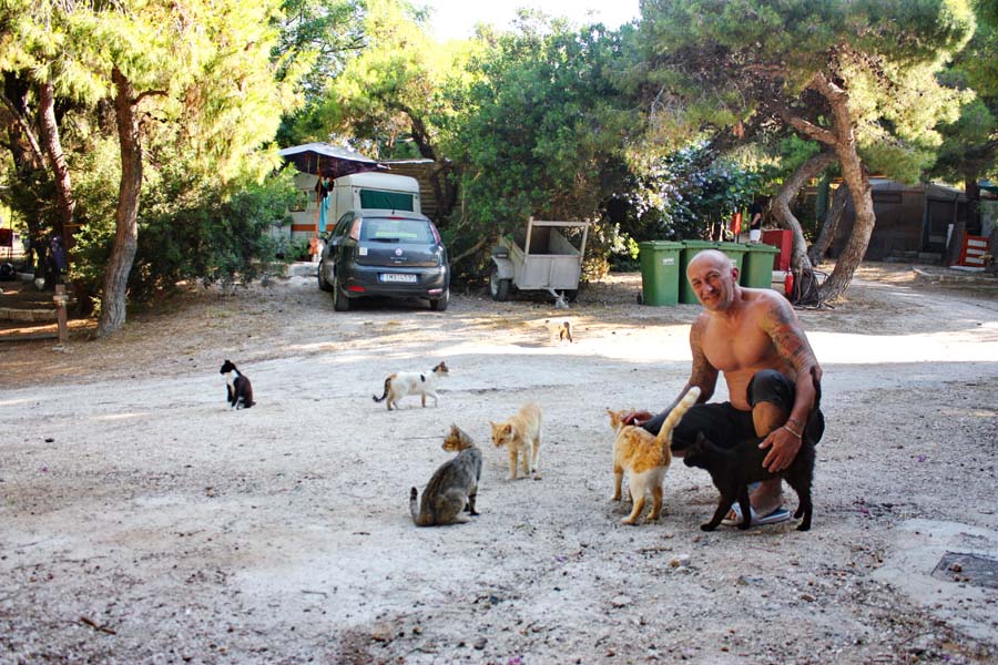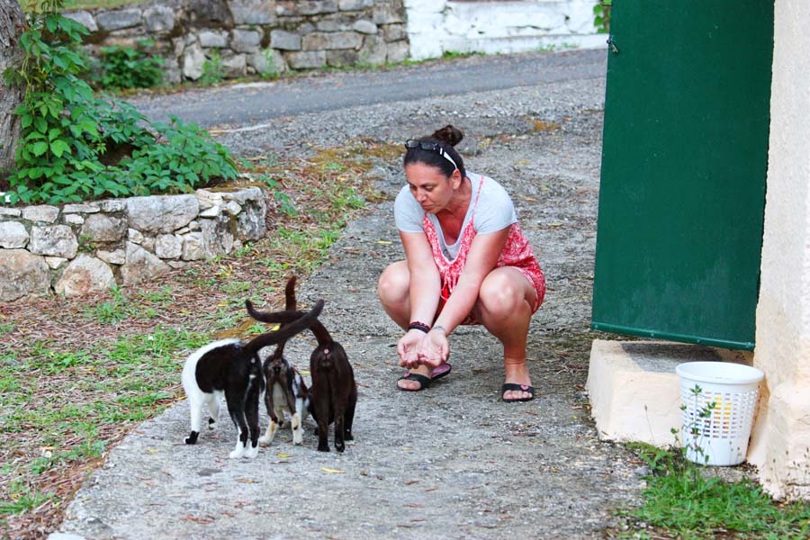 Nemamo dojam da se nalazimo u Grčkoj nego više u nekoj toscanskoj ili provansanskoj čaroliji. Očima širom otvorenim kao djeca u tvornici igračaka upijamo svu ljepotu ovog posebnog grada. Nakon što smo se prilično nahodali odlazimo do campa na počinak, barem smo tako mislili. Dolaskom do naše kućice dočekao nas je odbor za doček u vidu tri – četiri mačije njuškice koje su nas znatiželjno promatrale sa sigurne udaljenosti. To je bilo više no dovoljno da nas sjeti na naše dvije ljubimice Signoru i Kalistu koje smo povjerili na čuvanje našoj predobroj teti čuvalici Martini. Naša grčka priča je zahvaljujući ovim macama dobila poseban ugođaj. Sve naredne dane našeg boravka na Krfu obilježila su ova draga bića. Budući da ljetna sezona još nije počela ne radi ni restoran a niti trgovina u kampu pa su ove cice prepuštene same sebi. Da stvar bude gora jedna od njih je mama i doji jedno predivno pufnasto mače koje ju je doslovce pretvorilo u hodajući kostur. Istog trena bacili smo se u akciju na način da smo nahranili gladne životinje i dali im svježe vode.