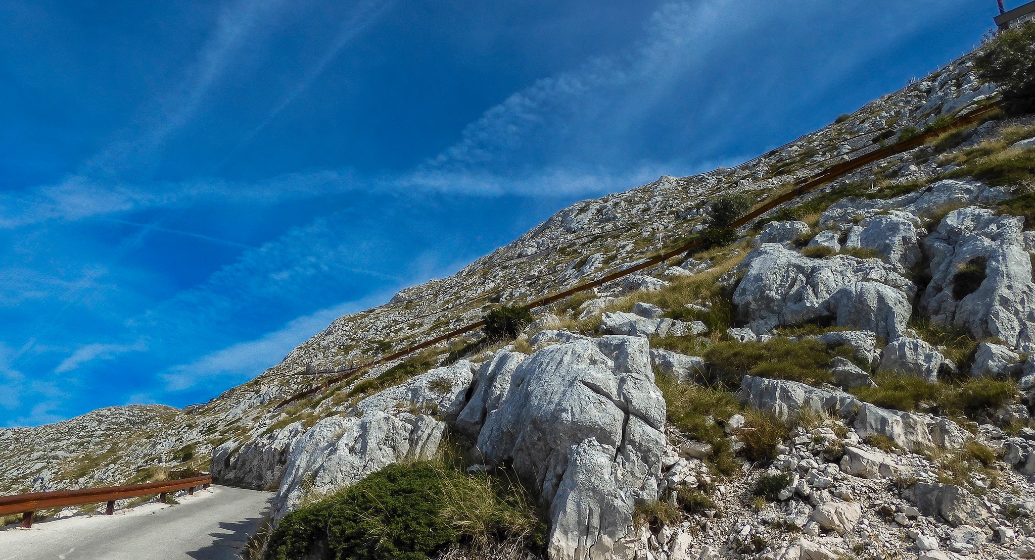 Nakon što sam prošao Vrata Biokova cesta se dodatno suzila i nastavila vijugati između kamenih gromada i vrtača. Na mjestu gdje je bio stari zidani vidikovac sagrađen je novi koji ima stakleni pod nad provalijom od nekoliko stotina metara. Naravno da sam zastao i prošetao po tome čudu neviđenom. Vrlo brzo, nakon planinarskog doma „Pod javorom“ ukazao se kameni odvojak prema još jednom vidikovcu. Nisam štedio motor i prošao sam tim kamenjarom 200-tinjak metar da bi došao do samog ruba litice iznad Makarske. Neprocjenjivo.