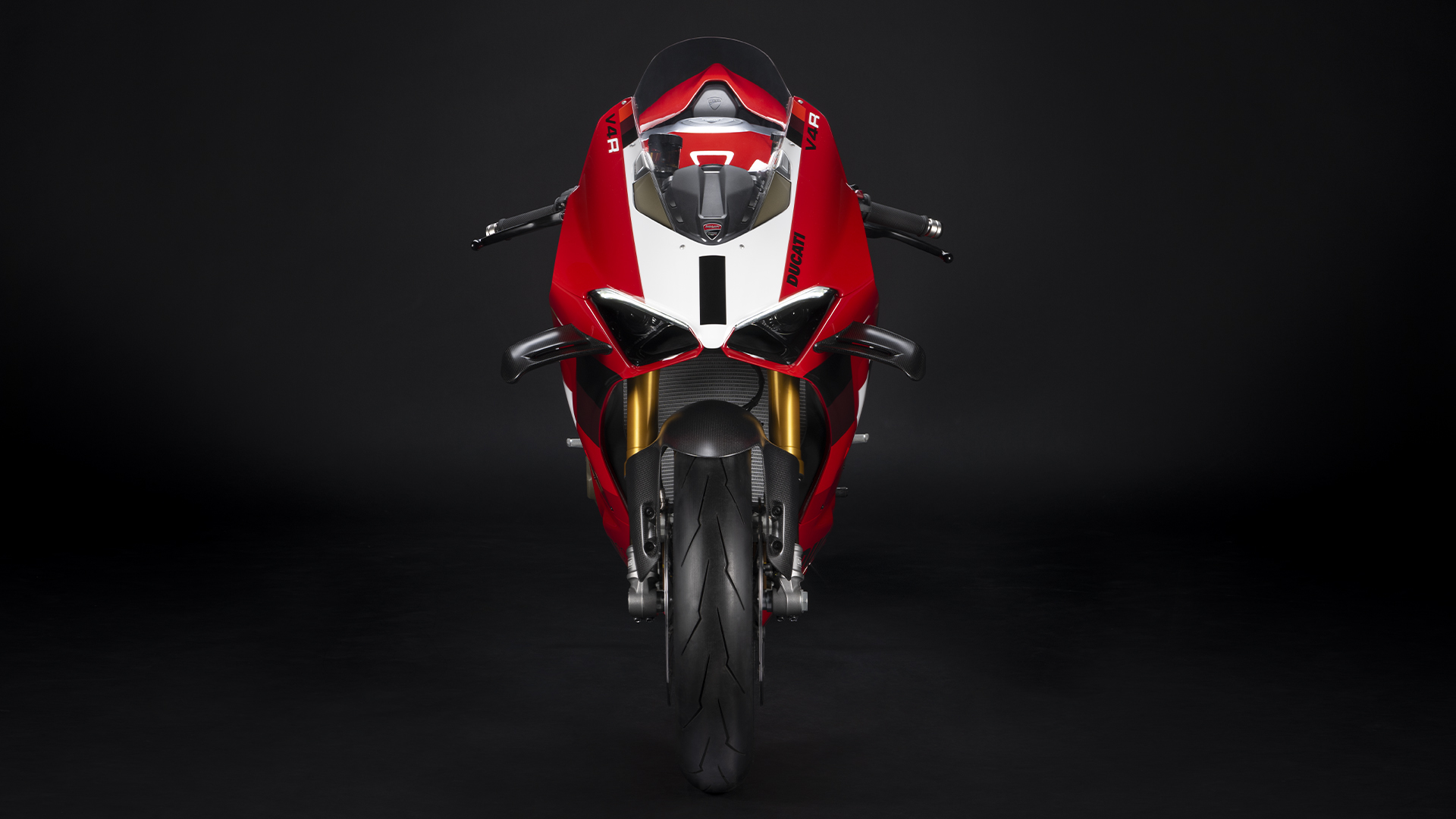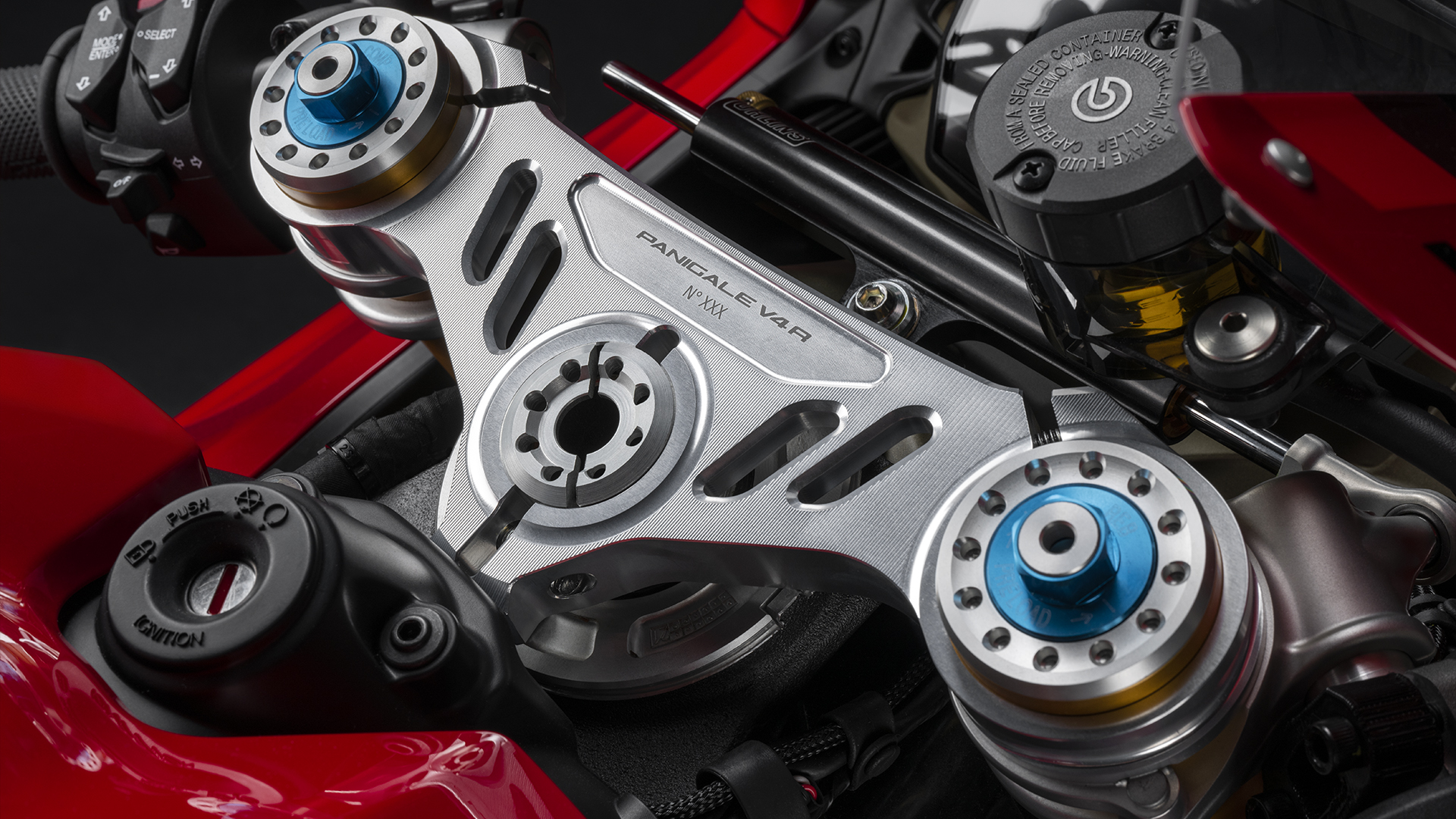 Panigale V4 R s punim trkaćim ispuhom od titana i otvorenim poklopcem spojke od ugljičnih vlakana, nije uključen u standardnu opremu, ali je dostupan kao Ducati Performance dodatak.
