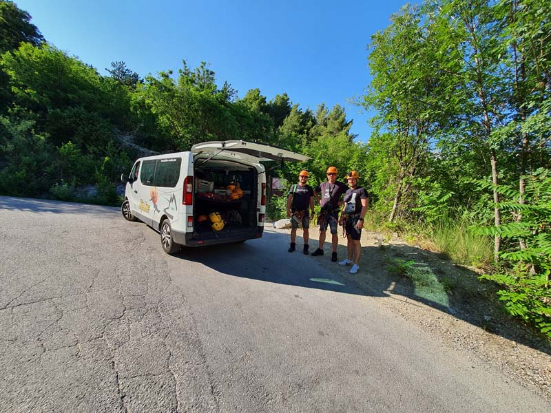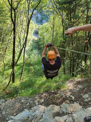 U 16:45 sati dolazimo u Omiš, ulazimo u agenciju te pri potpisivanju izjave o uvjetima korištenja primijetili smo da je Igor pozelenio i ukočio se od straha. Tek tada nam je priznao za svoj strah od visine, tako da nije bilo druge nego staviti ga u čamac i pustiti da pluta Cetinom dok nas trojica sjedamo u kombi koji nas vozi do prve žice. Prije prve žice imamo kratku obuku kada svi isprobavamo na pokaznoj žici. Budući da je meni to bio prvi put, nakon kratke obuke mislio sam da je to ništa, međutim, kad smo došli na prvu žicu koja je najduža i na najvećoj visini, malo me uhvatila panika, to moram priznati. Dariju je također bilo prvi put tako da je Hrvoje otišao prvi, a mi smo nekako zažmirili i „pregrmili“ tu prvu žicu. Prva žica duga je otprilike 700 metara, a na njoj se postiže brzina do 70 km/h. Moram napomenuti da smo imali dvojicu izvrsnih instruktora te je s njima bilo puno lakše to proći. Nakon prve žice, ostalih sedam žica je „mačji kašalj.“ Nakon dva i pol sata čistog adrenalina, kombi nas vraća u centar Omiša gdje nas Igor već čeka na kavi i tako smo obilježili naš peti dan putovanja. (Zipline smo platili 400 kn po osobi, a vožnju čamcem 300 kn).