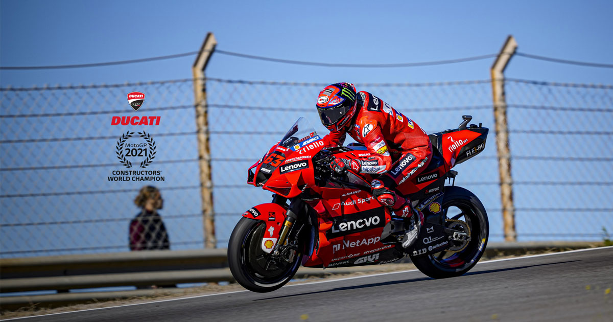Zahvaljujući još jednoj senzacionalnoj pobjedi Pecca Bagnaie na Autodromo Internacional do Algarve u Portimãu (Portugal), Ducati je drugi put zaredom osigurao MotoGP Svjetsko prvenstvo konstruktora, jednu utrku prije kraja sezone 2021. Talijanski proizvođač danas je osvojio svoj treći naslov svjetskog prvaka u premijernoj klasi na Grand Prix Brembo u Algarveu, na istoj stazi na kojoj je prošle godine osigurao svoju drugu titulu, 13 godina nakon prve.