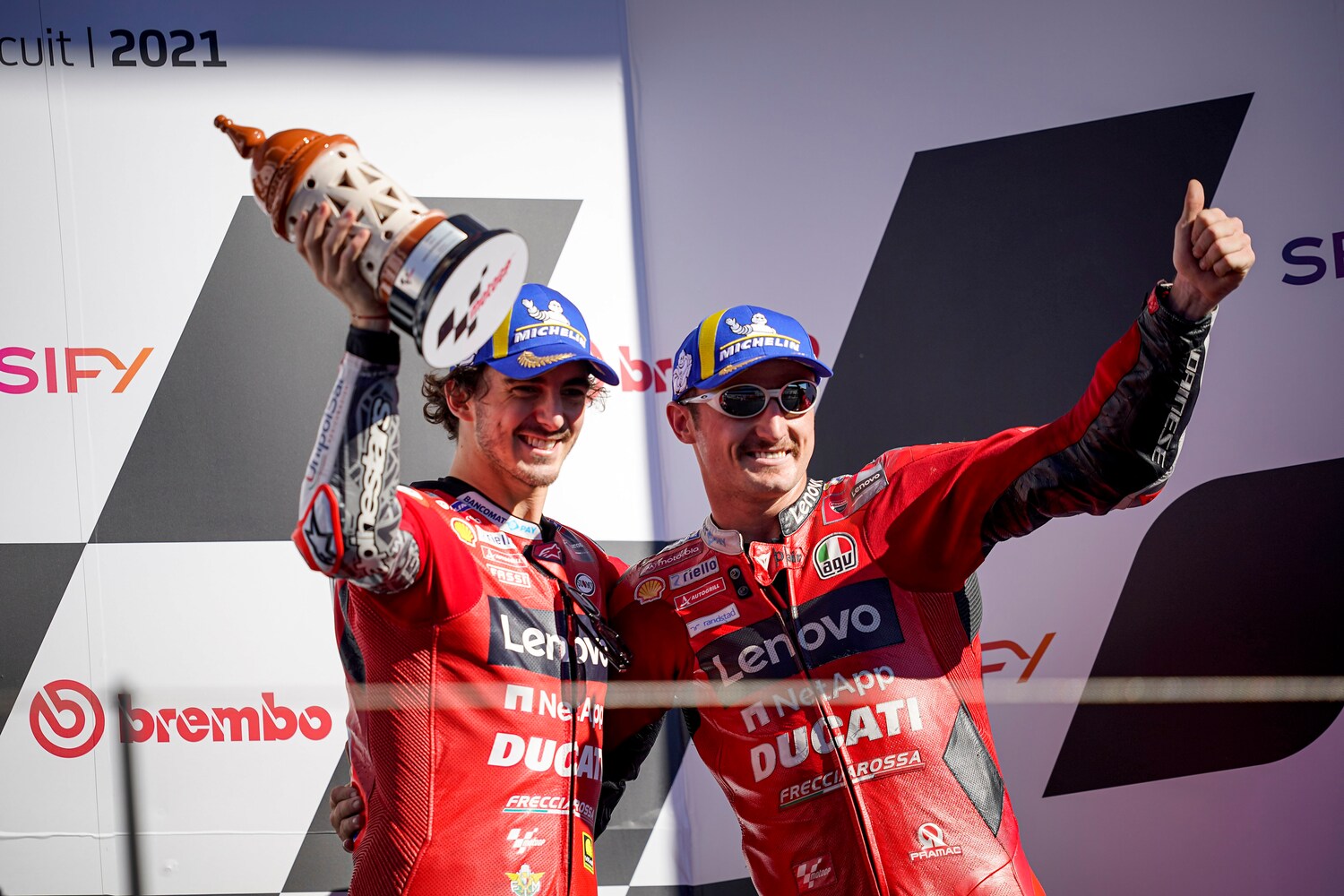 Osim uspjeha talijanskog vozača, autora besprijekorne utrke koju je vodio od početka do kraja startajući s pole positiona, još četiri vozača Ducatija doprinijela su pobjedi na Svjetskom prvenstvu konstruktora 2021., uključujući momčadskog kolege Jacka Millera, trećeg u današnja utrka. Australski vozač, koji je startao s drugog mjesta na gridu, uspio je osigurati treću stepenicu postolja prestigavši Alexa Márqueza nekoliko krugova prije nego što je crvena zastava prekinula utrku dva kruga prije kraja.