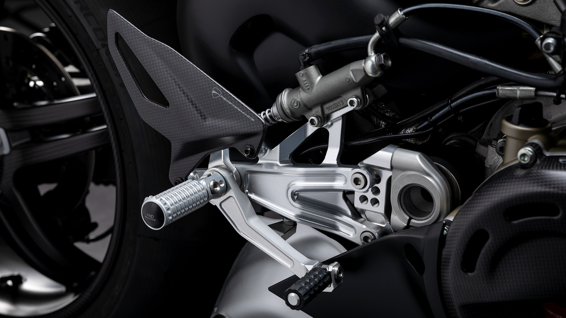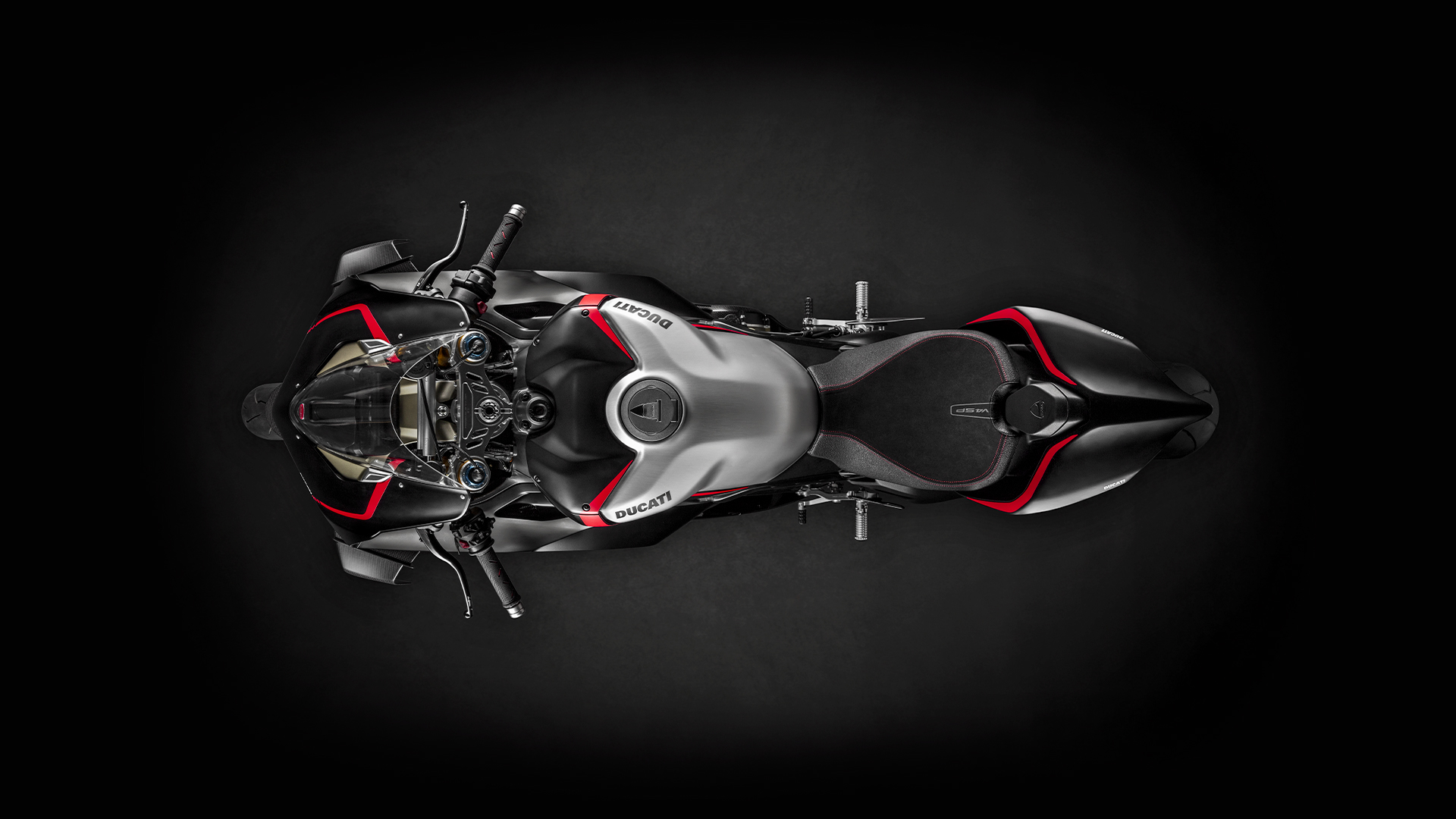 - STANDARD EQUIPMENTDucati Power Launch (DPL), Ducati Quick Shift (DQS) up/down EVO 2, Full LED lighting with Daytime Running Light (DRL), Ducati Electronic Suspension (DES) EVO with Öhlins suspension and steering damper, Quick adjustment buttons, Lithium-ion battery, Auto-off indicators, Racing style handle grips, Chain guard, Carbon fiber wheels, Carbon fiber front mudguard, Wings in carbon fiber, Adjustable rider footpegs in aluminium with heel guard in carbon fiber, Billet aluminium steering stem with bike number.