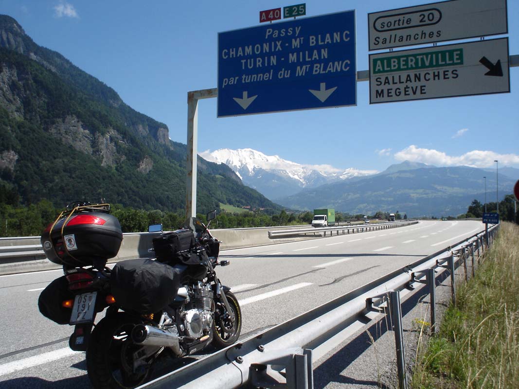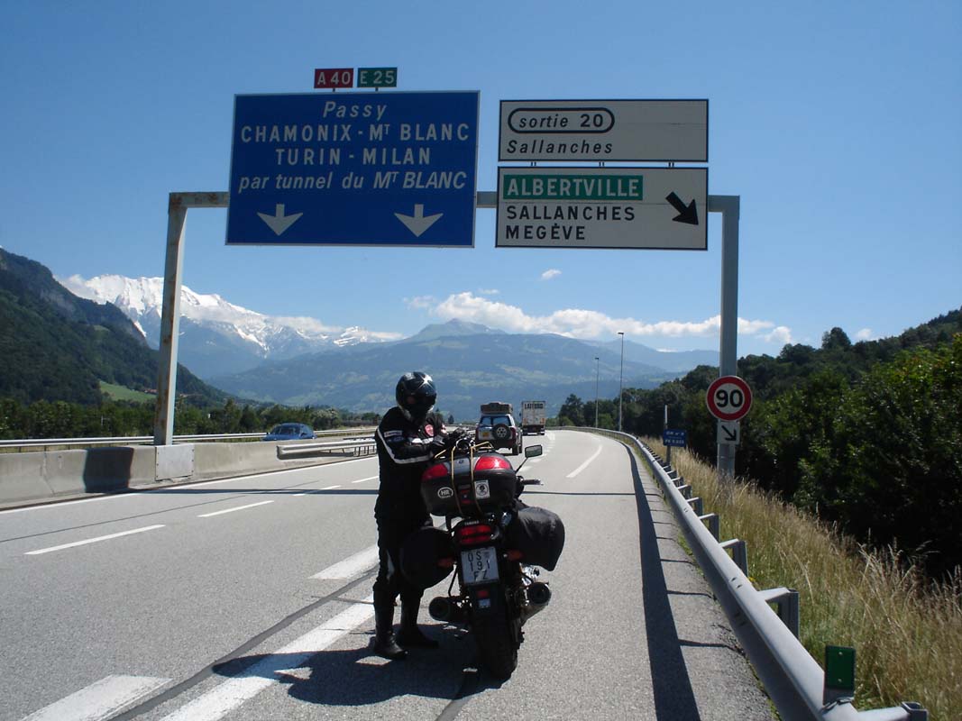 Put nas vodi ka Maconu na čijoj ćemo se periferiji odvojiti lijevo prema Genevi. Na jednoj benzinskoj pumpi susrećemo 10-tak Francuskih policajaca koji voza Yamahe FJR. One su službena vozila Francuske policije. Motocikli su potpuno novi i vjerojatno su ih vozili u neki veći grad. Pošlepali smo se iza njih jer nisu vozili ispod 180, tako smo dobar dio puta prevalili u teškom prekršaju ali pod pratnjom zakona. Može li ljepše. Kod Geneve plaćamo prvu cestarinu 27 €. Put nas dalje vodi ka Chamonixu i tunelu Mont Blanc.