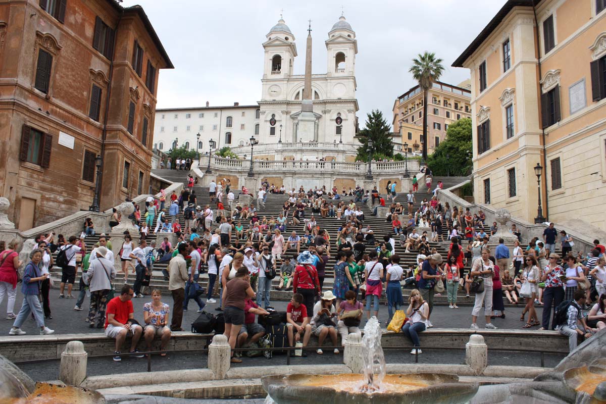 Put nas dalje vodi prema poznatim Španjolskim stubama jednom od simbola vječnoga grada. Ove stube najbolji su spomenik rococoa u Rimu. Dao ih je izgraditi kralj Luj XV između 1723 i 1726 god. a puni naziv im je Scalinata della trinita dei monti. U podnožju stuba nalazi se Berninijeva fontana La Barcaccia. Stvarno veličanstveno. Sjedimo neko vrijeme u mnoštvu na stubama. Gužva je kao u košnici. Ulicom Via Dell Corso koja je prepuna trgovina visoke mode najpoznatijih talijanskih i francuskih proizvođača dolazimo do fontane Trevi.