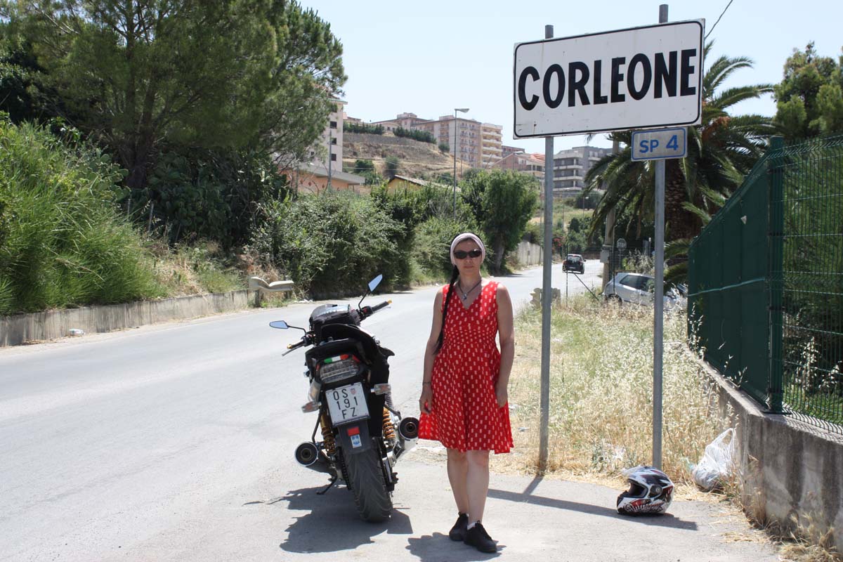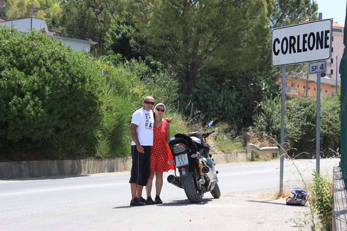 Pustinja i temperatura viša od 40 C spalila je sve ispred sebe. Hrvatski putevi kroz polja su auto ceste za ovo zlo ovdje. Teško da bi i kakav enduro ovdje prošao lako. Dante, taj patuljak, očito nikad nije bio na Siciliji jer nema on pojma što je pravi pakao. Nada mi na izmaku snaga kaže: pa što je trebalo tim ludim filmašima da ovdje snimaju jedan od kultnih filmova ne tako davne prošlosti kada su to mogli odraditi u Hollywoodu. Neznajuči odgovor kažem joj: valjda zato što nisu normalni. Potpuno slomljeni stižemo u Corleone. Kod table na ulazu smogli smo snage za fotografiranje a potom se parkiramo na glavnom trgu i dalje pješačimo. U starom dijelu grada vrijeme kao da je stalo a u noviji nismo ni išli. Nemožemo se napiti tekućine koliko smo dehidrirali. Njuške oko nas neodoljivo podsječaju na likove iz filma. Negovore puno samo snajpaju uokolo. Djevojkeu lepršavim ljetnim haljinama hodaju graciozno ulicama ove zabiti. Eto to je dakle Corleone. U caffeu Don Corleone oporavljamo se neko vrijeme a onda bježimo u Scopello na plažu.