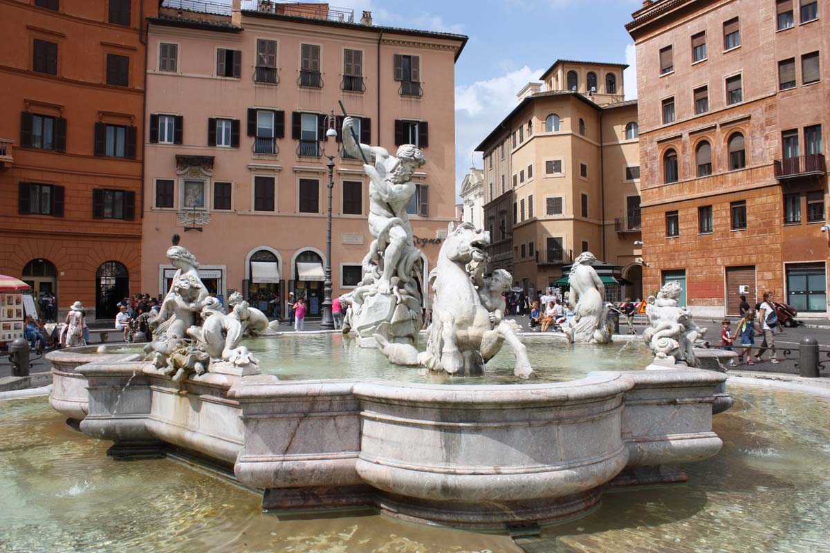 Četiri kipa koja okružuju fontanu iz 1651 god. personifikacija su četiriju rijeka na četiri različita kontinenta Ganges (Azija), Dunav (Europa), Rio de la Plate (Amerika ) i Nil (Afrika). Obelisk u sredini isklesan je od Egipatskog granita. Već prilično umorni od hodanja usput se osvježavamo na mnogim terasama caffea. Cijene su ubitačne ali nemamo puno izbora. Još par ulica i nalazimo se u stvarnom središtu Rima na sjecištu gradskih prometnica, odnosno na veličanstvenom trgu Venezia. Palaču Venezia na istoimenom trgu dao je podići Papa Pavao II koji je s njenog balkona gledao konjske utrke. S istog balkona puno godina kasnije Mussolini je držao svoje gorljive fašističke govore. Eto netko nešto i svatko u svoje vrijeme.