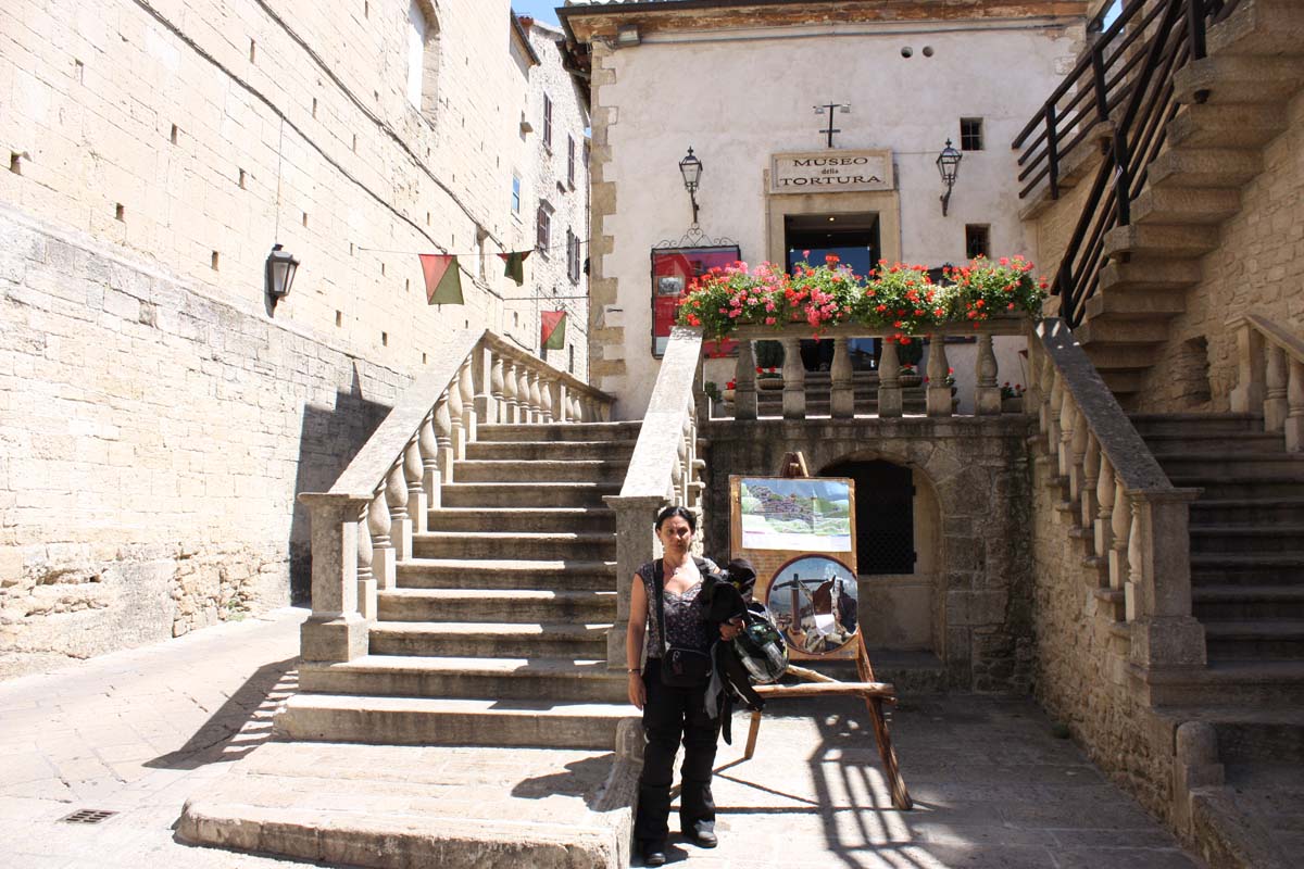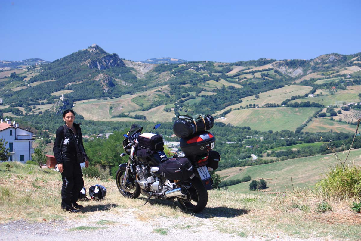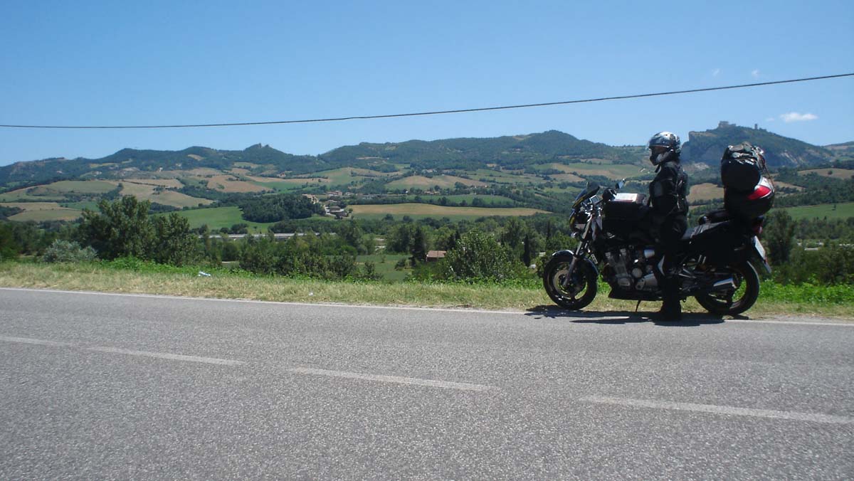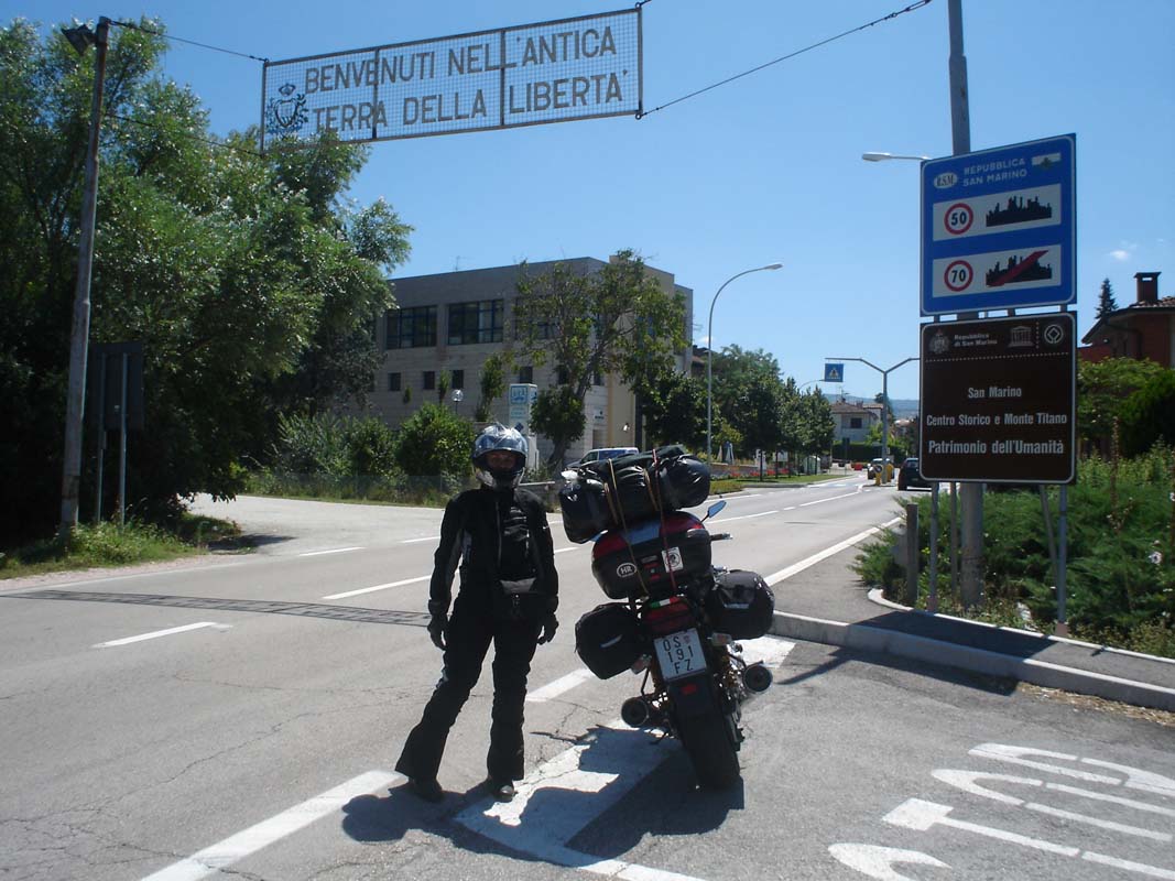 Kod Arezza se odvajamo prema San Marinu. Ovdje počinje prava golgota zbog ceste koja je toliko loša i uska da bi i momci sa enduro motorima imali dosta muke. Priroda je predivna, ali kao da nije dala mogućnosti da se njome prođe bez puno truda. Kako je jedan frend davno rekao „sve sama jama budi bog s nama“. Zaključujem da smo brže napredovali 1943. prema Staljingradu. Na nekakvim kolcima pribijenim uz put stoji natpis Rimini. Držimo se putokaza kao pijan plota i nakon 50-tak km kroz ovo bespuće izbijamo na odličnu cestu ispred San Marina. Dok se uspinjemo cestom u grad pred nama se otvara panorama kakva se rijetko viđa. Osjećaj je kao da nismo na zemlji nego na nekoj drugoj planeti. Riječ nepregledno ovdje gubi svaki smisao. Pogled seže preko brda i brda i opet brda i dolina i udolina i opet i tako bez kraja. Savršeno. U San Marinu radimo pauzu od sat – dva, taman dovoljno za ručak, kratak obilazak, i naravno kupovinu parfema, jer ovdje je bescarinska zona i cijene pojedinih artikala su i do pet puta niže nego drugdje.