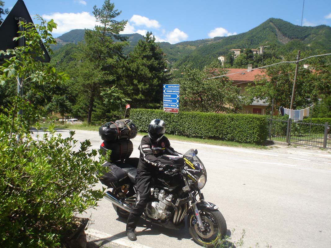 Ovdje počinje pravi tulum. Subota je i ovdašnji motoristi u full opravicama (uglavnom kožnim kombinezonima) jure i utrkuju se baš ovom cestom. Samo zuje oko nas koji se turistički vozimo po njihovoj veekend pisti. U Italiji svi do jednog voze motore i skutere kao da su ih maločas ukrali. Dao bih ja njima svima po ušima ali na godišnjem sam ,vozim se lagano i dobro mi je. Mnogi koji su nas pretekli okreću se u nevjerici misleći da sam neka teška baba koja se ne usudi zavrnuti gas. To me je dobro nasmijalo.