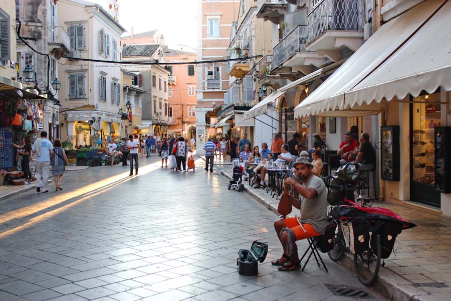 Nakon što smo stvari pobacali po kućici, i pod tušem saprali prašinu sa puta odlazimo do 8 km udaljenog grada Krfa. Krf, Kerkira, Corfu ili kako ga još sve nazivaju ubraja se među najljepše gradove u Grčkoj. Krf je osobit otok i za same grke jer na njemu su talijanski, francuski ali i britanski utjecaj dali posebno ozračje. Parkiramo se u strogom centru i uskim kamenom popločenim ulicama dajemo se u istaživanje ovoga grada. U lokalnoj Pizzeriji uživamo u slasnoj pizzi i pivu Mithos. Grad Krf dao bi se porediti jedino sa čuvenim San Marinom, Nicom ili Saint Tropeom. Ulice su prepune suvenirnica, prodavaonica autohtonih rukotvorina, kožne galanterije i domaćih agrikulturalnih trgovina. Vrlo je slično kao u toskanskim biserima Monte Pulcianu, Montalchiniju, Massi Martimi ili San Girmianu.