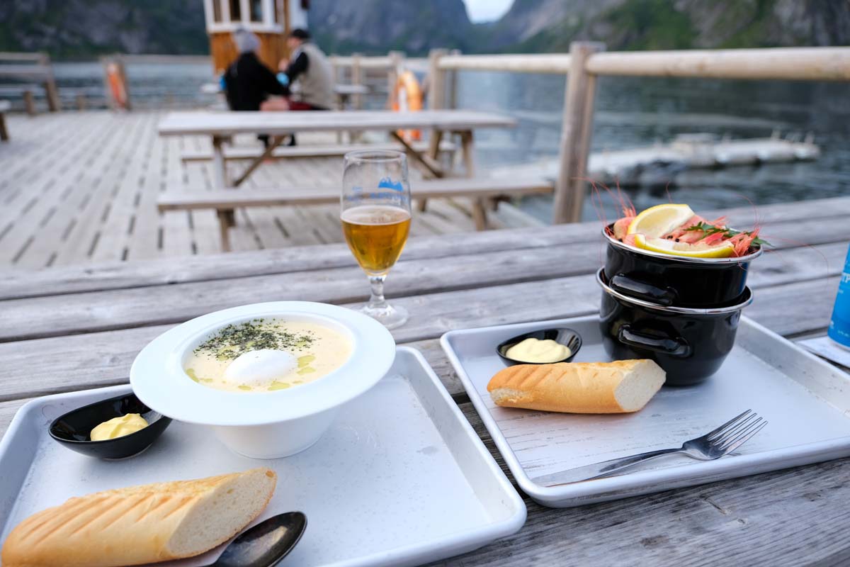 Ulazim i nailazim na hladnjak prepun domaćih delicija poput lososa, bakalara i kozica. U razgovoru s konobaricom saznajem da se ovdje sve jede sirovo! Gledajući u hladnjak i filete sirove ribe, odluka pada na juhu od bakalara i sirove kozice, uz koje tražim dodatnog limuna, te sjedam na terasu koja se na drvenim stupovima nadvija preko obale, točno iznad mora. Osim u hrani, uživam u tom ambijentu nakon čega nastavljam s vožnjom do samog kraja ceste, točnije sela na vrhu Lofotena jednostavnog imena,.... A!