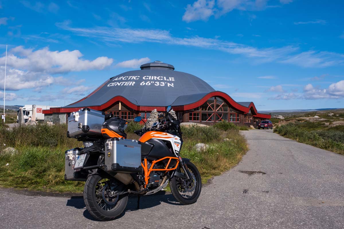 Nakon gradića zanimljivog imena "Mo i Rana" stižem na visoravan i nailazim na Arctic Circle Centar koji označava rub Arktičkog kruga. Izgrađen je u isto vrijeme kao i ova dionica E6 na visini od 680 m/nv, uz rub Saltfjellet-Svartisen nacionalnog parka s jedinstvenom florom i faunom te mnoštvom jezera, a uz to je prirodno stanište sobova. Vozeći preko opustošene hladne i vjetrovite visoravni razmišljam kako ludo zvuči činjenica da svoje prve kilometre vozim u Arktičkom krugu, gdje ljeti skoro pa nema noći, ali i zimi skoro da nema dana. I stvarno, dan je sve duži i duži kako idem sjevernije.
