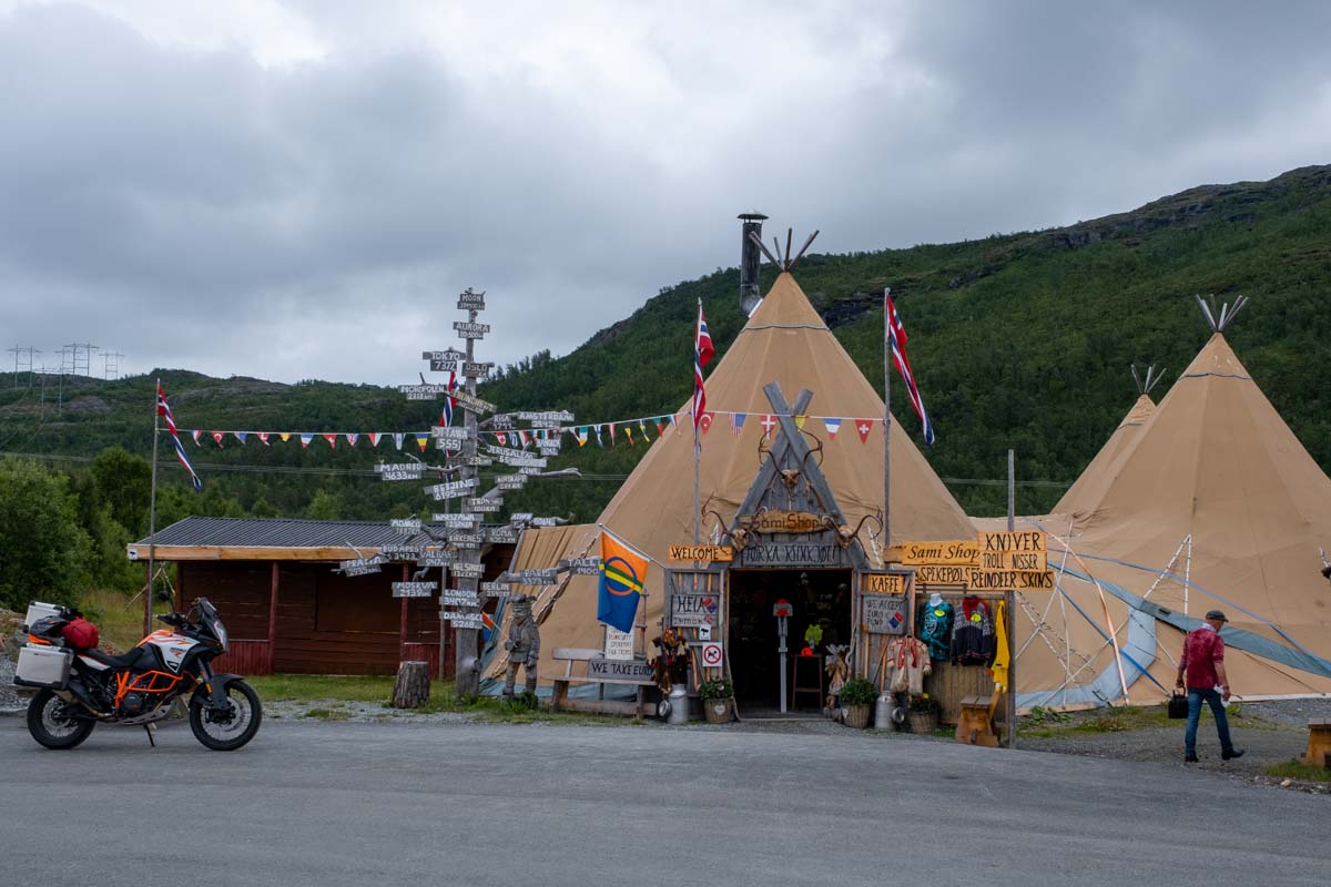 Vožnja ravnicama s pokojim laganim zavojem u bespuću tundre i uz malo prometa stvara osjećaj samoće, posebno u mojem slučaju. Kao da sam sam na svijetu. Dobro, ne baš sam, ipak je moj vjerni pratitelj na kojem jašem tim bespućima sa mnom. Adventure guta kilometre puno lakše nego ja, a znakove umora uopće ne pokazuje i da se njega pita vjerojatno ne bi stajali putem. Ipak, odmor hvatam na jako zanimljivom stajalištu Heia gdje nailazim na Sami shop, najoriginalniji lokal na cijelom putu, odnosno trgovinu punu suvenira ispod velikog vikinškog šatora sa zemljanim podom i vatrom na kojoj se kuha kava. Ispijam kavu i nastavljam prema Langfjordu gdje uz pogled na snijegom pokrivene planine ručam tik do mora.