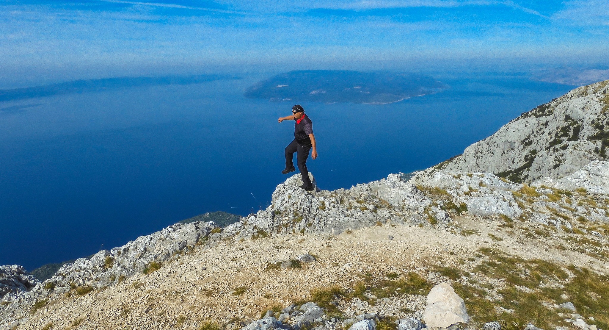 Nakon što sam prošao Vrata Biokova cesta se dodatno suzila i nastavila vijugati između kamenih gromada i vrtača. Na mjestu gdje je bio stari zidani vidikovac sagrađen je novi koji ima stakleni pod nad provalijom od nekoliko stotina metara. Naravno da sam zastao i prošetao po tome čudu neviđenom. Vrlo brzo, nakon planinarskog doma „Pod javorom“ ukazao se kameni odvojak prema još jednom vidikovcu. Nisam štedio motor i prošao sam tim kamenjarom 200-tinjak metar da bi došao do samog ruba litice iznad Makarske. Neprocjenjivo.