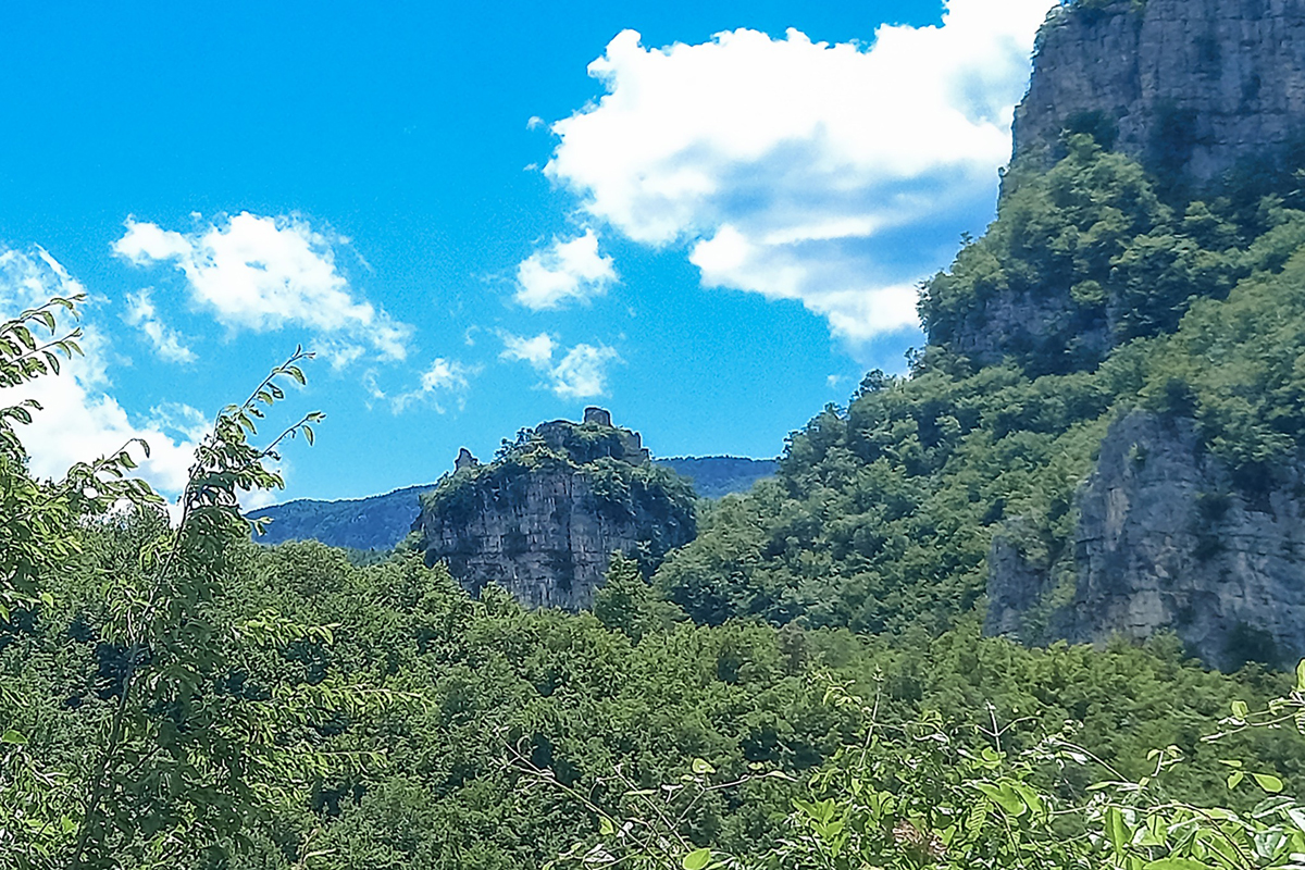 Na vrhu sam brda, put je makadamsko-šljunčani, vodi preko neke livadice i kroz voćnjak te naglo završava. Na kraju sam puta, a nisam stigao do cilja već do male crkvice Svetog Petra i Pavla. Valjda bi odavde trebao nastaviti pješice kroz neprohodnu šikaru i popeti se na susjednu liticu na kojoj leže ostaci drevnog Visuć grada. Ipak je netko bio razuman pa je raskrčio komad grmlja kako bi se i odavde grad vidio.